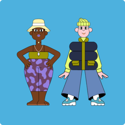 We used a bold colour palette and graphic style to give the work a retro edge, while outlined forms add definition and stage the characters. The animations are true to life, but we added fresh touches like the elongated limbs.